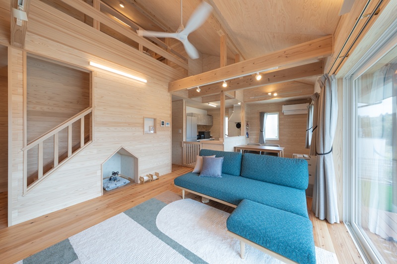 リビング内に計画されたおこもり感のあるワンちゃんスペースは居心地も良さそう・・