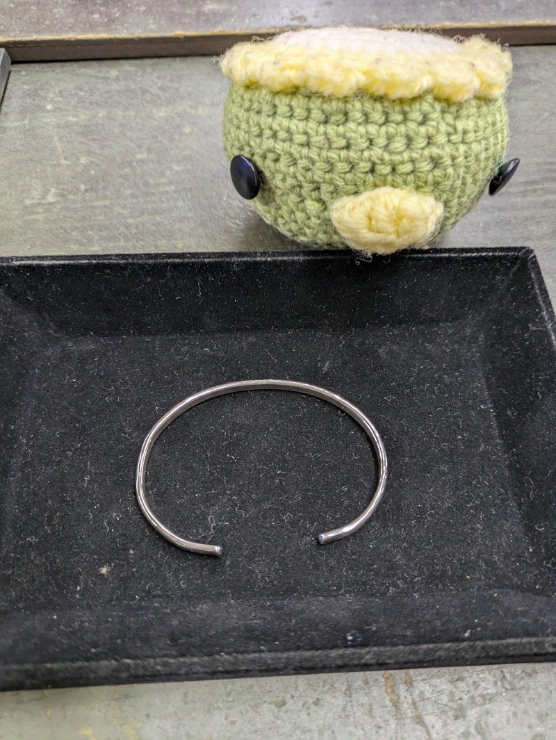 模様入れや曲げるのは専用のやり方があるので、スタッフの方にも手伝ってもらい、裏面の仕上げの磨きまで自分で行い、表面はスタッフの方に仕上げてもらい完成しました。
