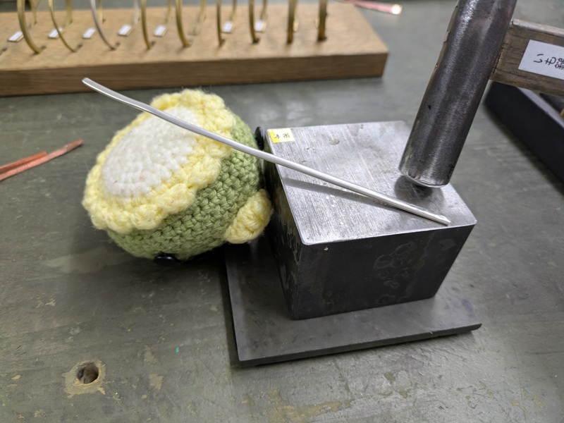 説明を受けて、サイズ確認や模様付けの練習を銅板で行って、いざ!!シルバーに模様を打ち付けて…力づく?!で曲げて…いきました。