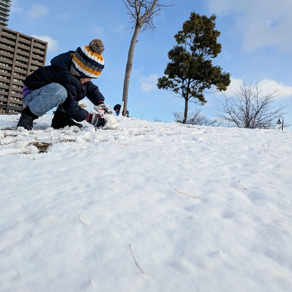 少し積もった日の午前中に、公園で雪だるま作りとそり遊びをしました。