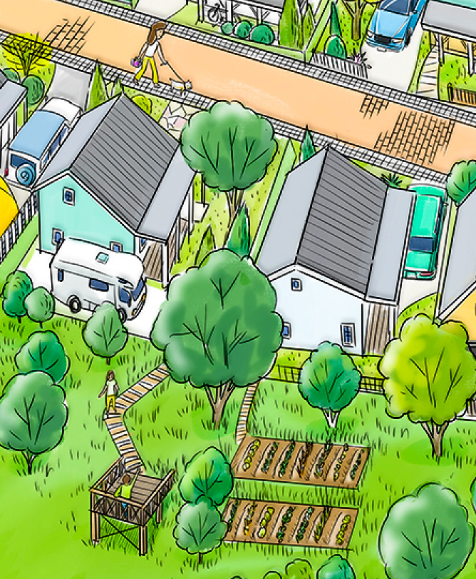 家を建てて終わりではなく、人生のステージや趣味の広がりに合わせて、庭やガレージ、菜園を「追加」していく。住まい手が自由にキャンバスを広げられる、全国的にも珍しいカスタマイズ型分譲地を目指します。