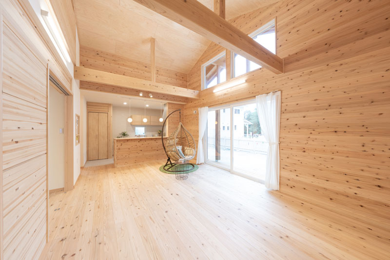 地域の無垢材をたっぷりと使用した『平屋の家』。リビングはまるで森林浴をしているかのような心地よさ。