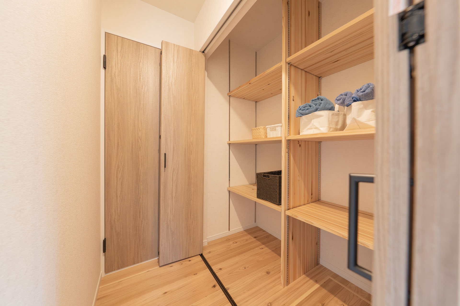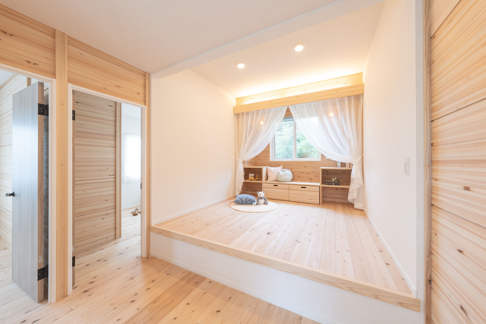 建物を構造体(スケルトン)と、内外装や間取り(インフィル)に分けて設計する工法です。杜の家オリジナル無垢杉材パーテーション「でき杉くん」で間取りが変わる!ライフスタイルが変わる!