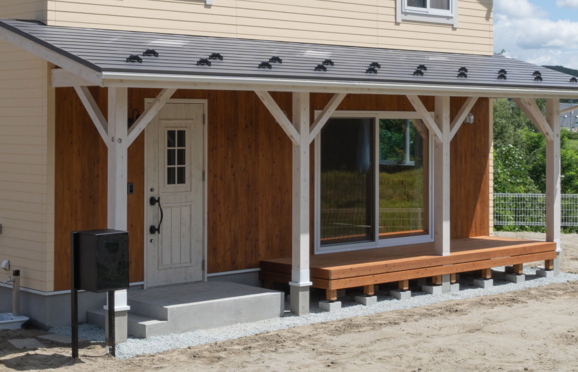 大きなカバードポーチは雨の日でも屋外スペースが使え、アウトドア派に人気です