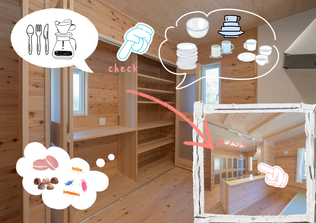 背面の造作パントリーはキッチン周りのものを全て収納して、造作扉で隠すことができ急な来客時もスマートにお出迎え