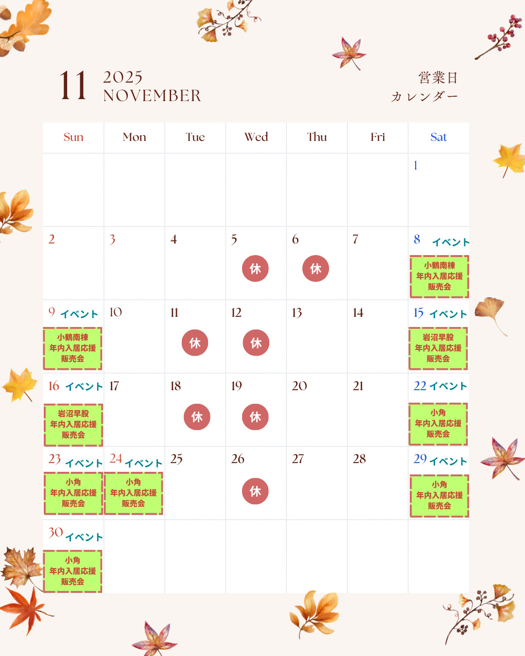 11月の営業日・休業日・イベントカレンダーのお知らせ