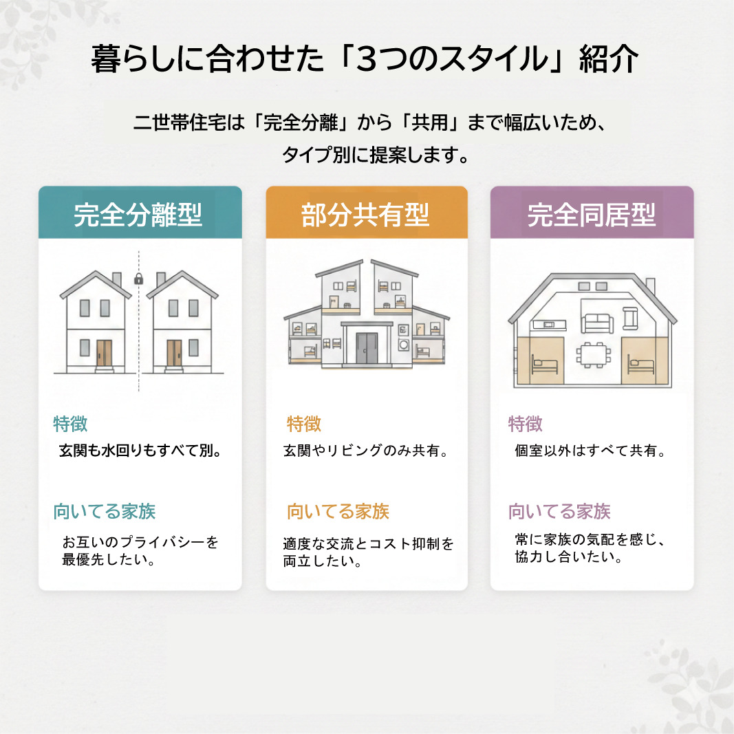 今までの二世帯住宅は暮らしに合わせた「3つのスタイル」でした
