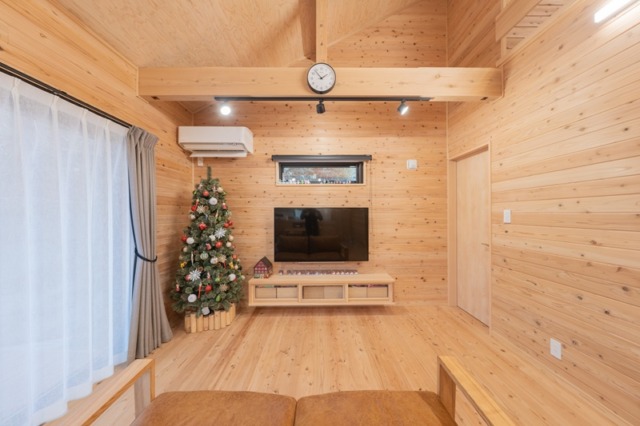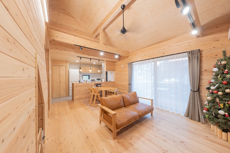 壁も天井も板貼りで、まるでログハウスのようなLDK。