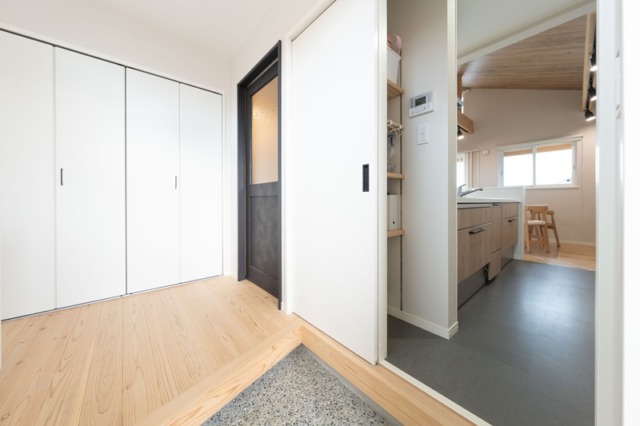 玄関からパントリー&キッチンへ直接アクセスできる便利さが魅力。