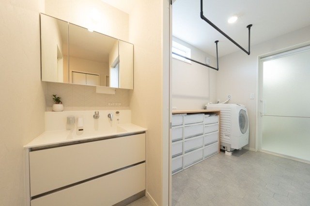 洗面所と脱衣室スペースを分けたことで生まれたストレスフリーな生活。